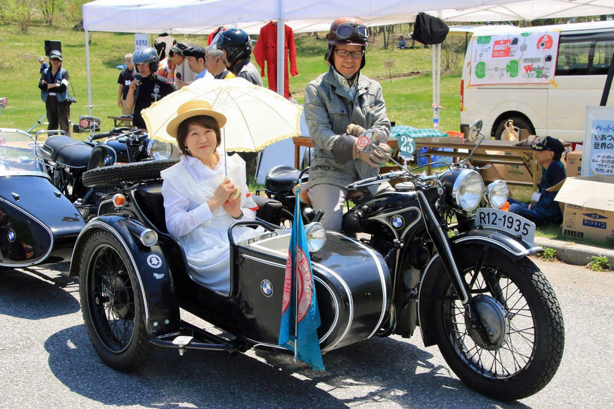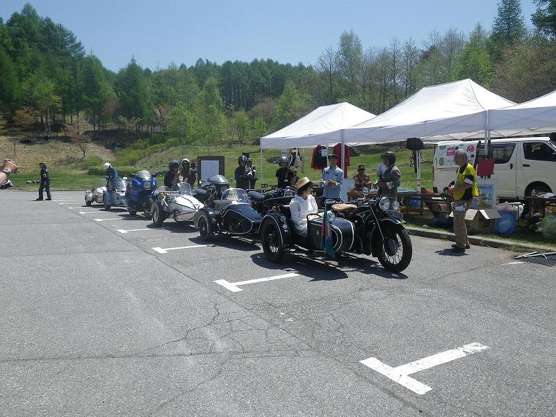 実は昨年秋のミーティング。イエローペリル(黄禍)の回で、浅間の名物男の1人である某氏から、サイドカーオーナーに春はサイドカーでデレガンスを埋用!との呼びかけがあり、それがさまざまなルートから拡がって、集まったのが私を含めた12台。