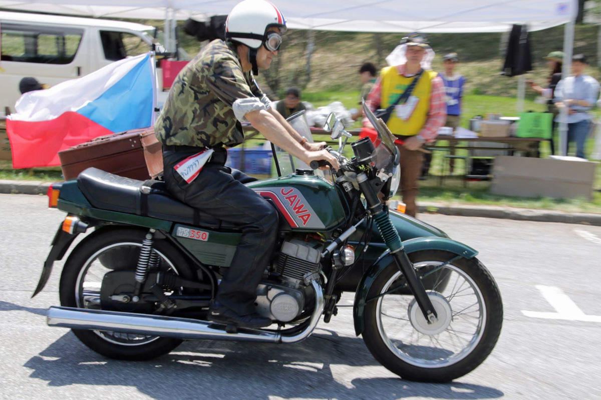 こいつはレアですねえ。チェコ製の「ヤワ」。2サイクル2気筒350ccですが、基本設計は1950年代。あんまりサイドカー向きじゃあない気がするんだけどなあ。メジャーなバイクでいらっしゃることの少ないオーナーさんらしいと言えばらしいのですが。