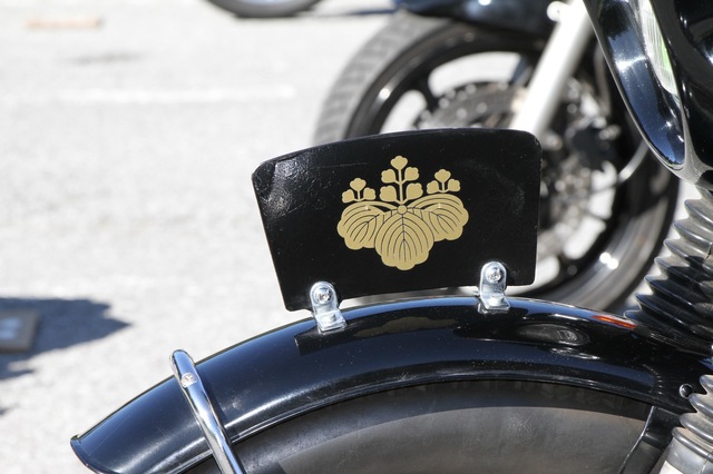 皇宮警察の桐の紋章も輝く、退役したサイドカーの1台。これは左カーですが,右カーとワンセットで、御用車両の左右を固めた1台です。年代的にはK5の頃ですが実際はわかりません。当時は公用車専用の払い下げ業者があって、赤灯などの特殊装備を外した状態で廃棄になった車両が手に入ったのだそうです。確かに元覆面パトカーを持っていらっしゃる方もいましたね。