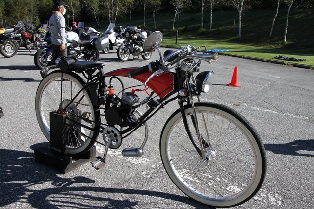 単にエンジンを積むだけじゃ無くて、全体的にアメリカン・ボードレーサー風の仕上がりにはセンスの良さも感じられます。走りも軽快で、思ったより速いな、という印象。本当にバイクの楽しみ方も色々だなあと思わせてくれました。